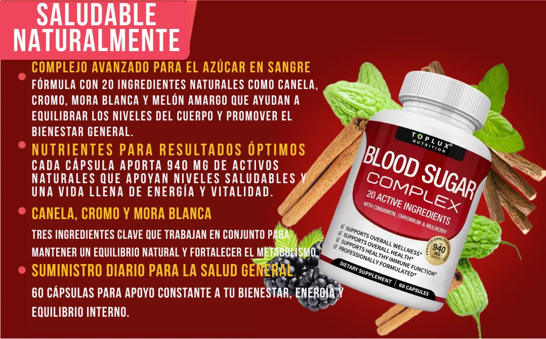 Es un suplemento natural elaborado con ingredientes de origen vegetal que ayudan a mantener un equilibrio saludable en los niveles de azúcar en la sangre y a mejorar el bienestar general.