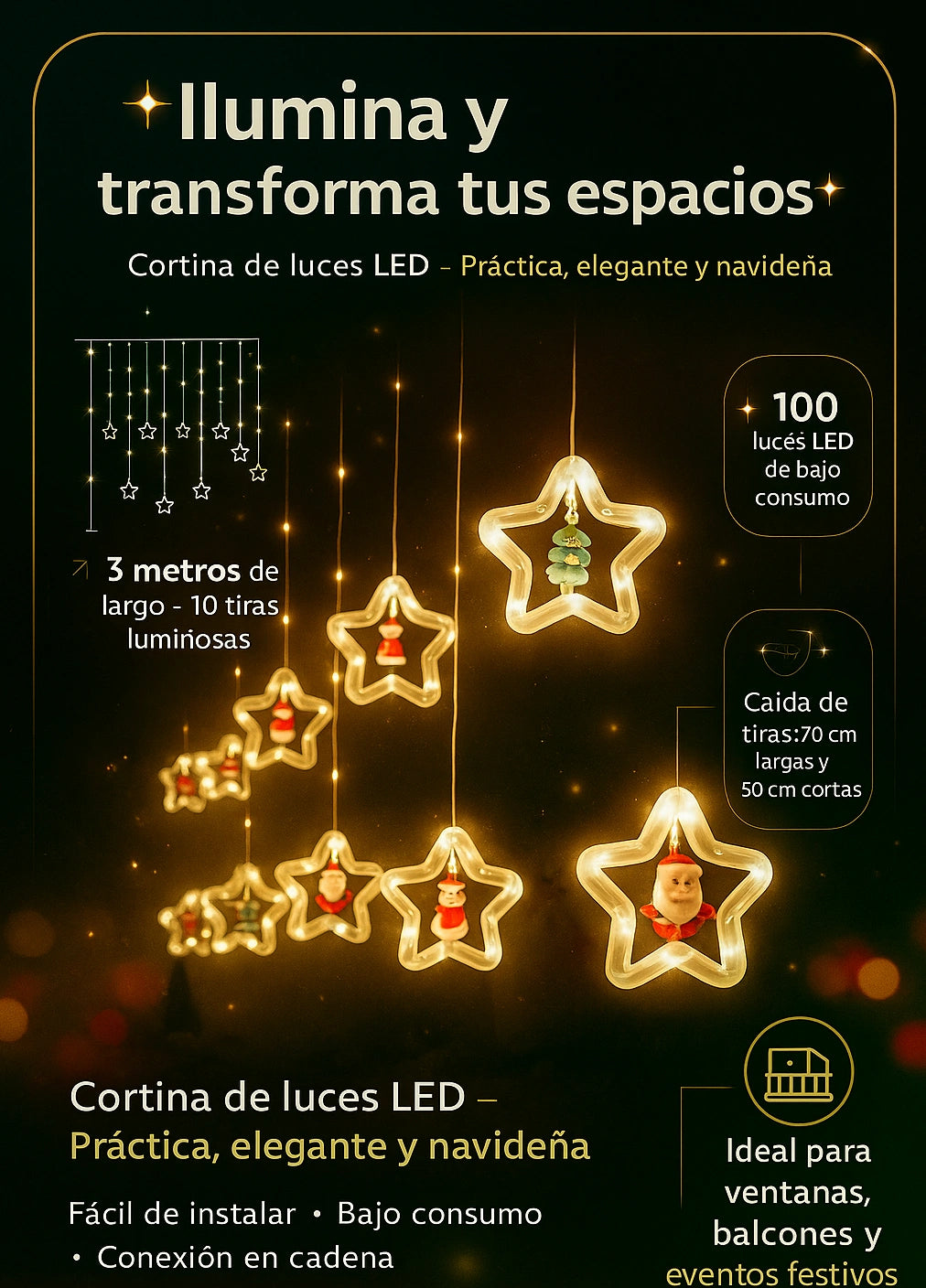 Cada tira cuenta con 3 metros de largo, perfecta para decorar árboles de Navidad, balcones, ventanas o cualquier rincón del hogar. Si necesitas cubrir más espacio, puedes conectar varias tiras fácilmente.