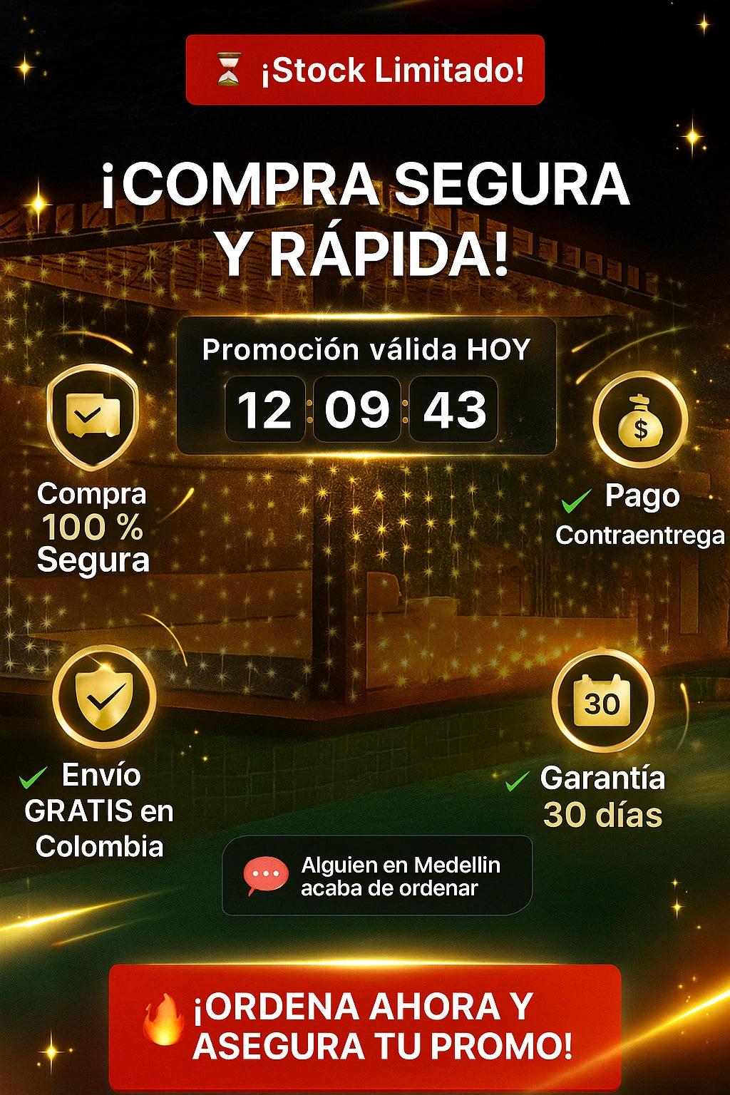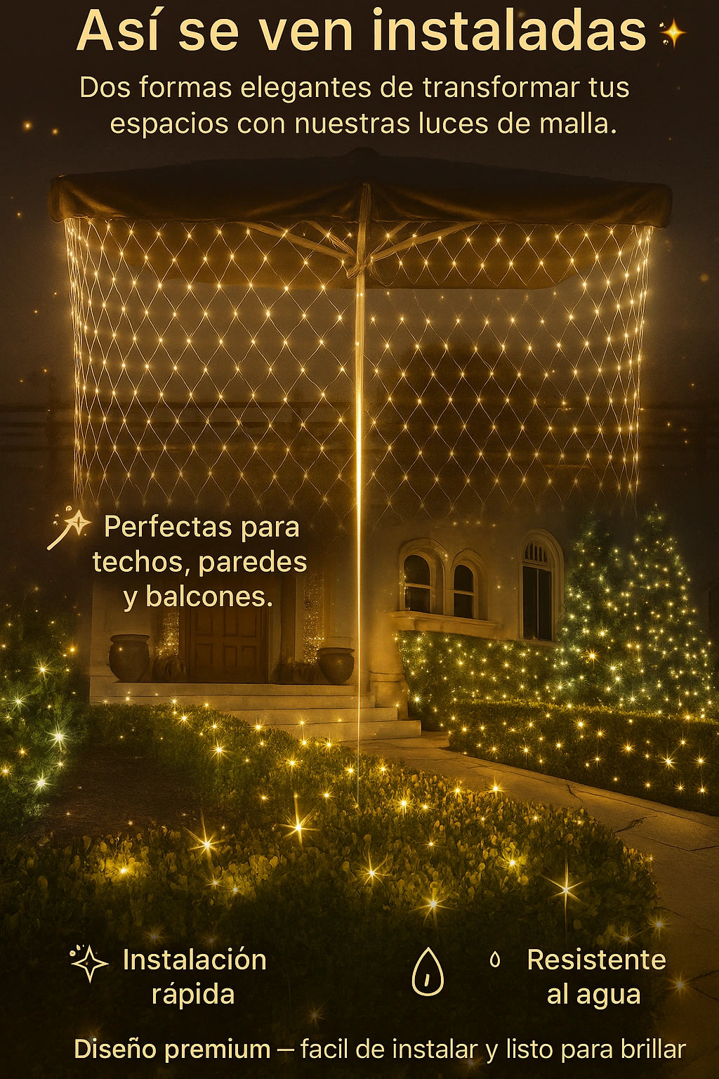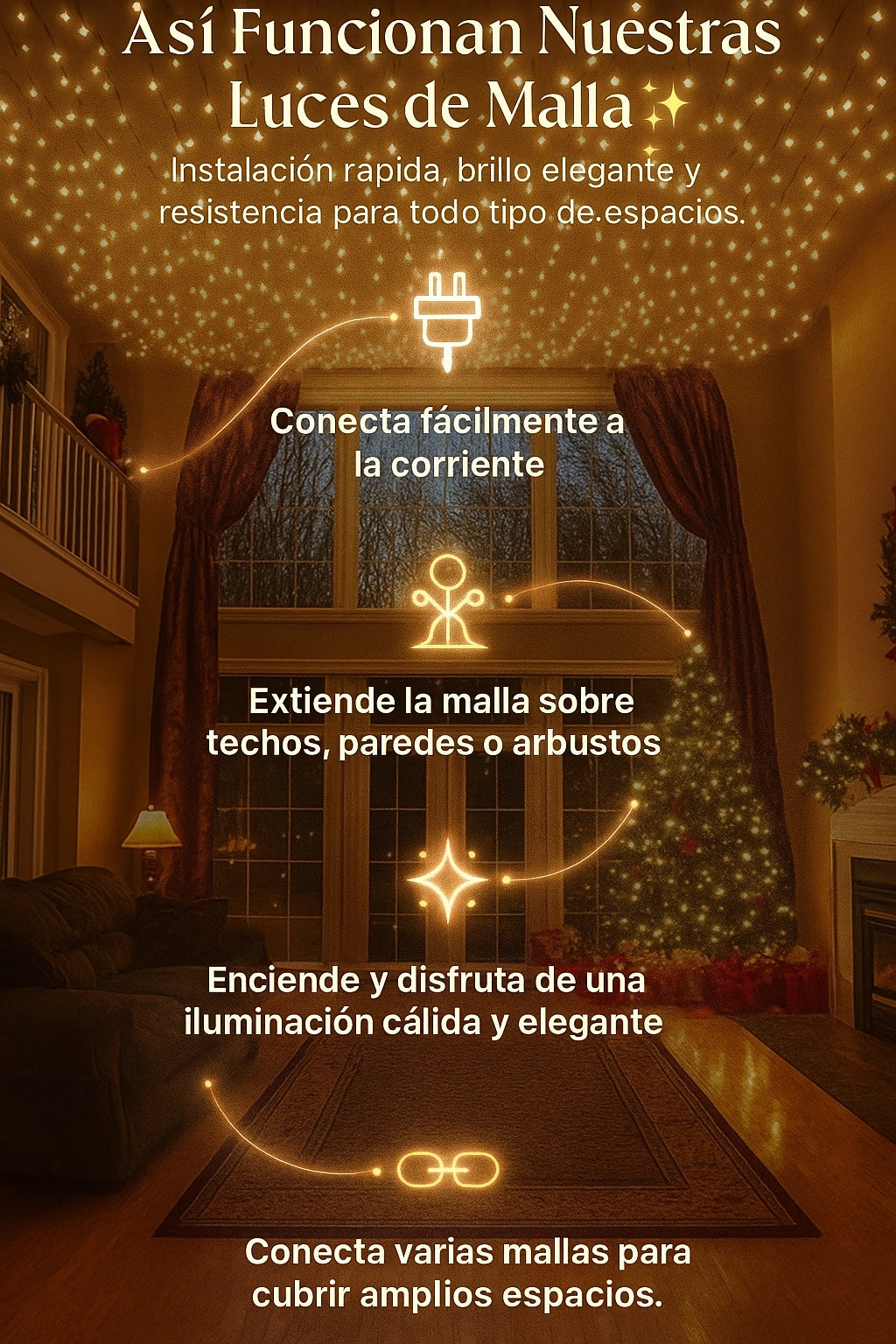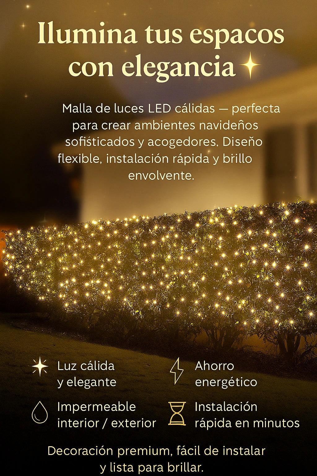 📏 Cada malla mide 1 metros y contiene 100 luces LED, distribuidas de forma uniforme para lograr un brillo cálido y elegante.