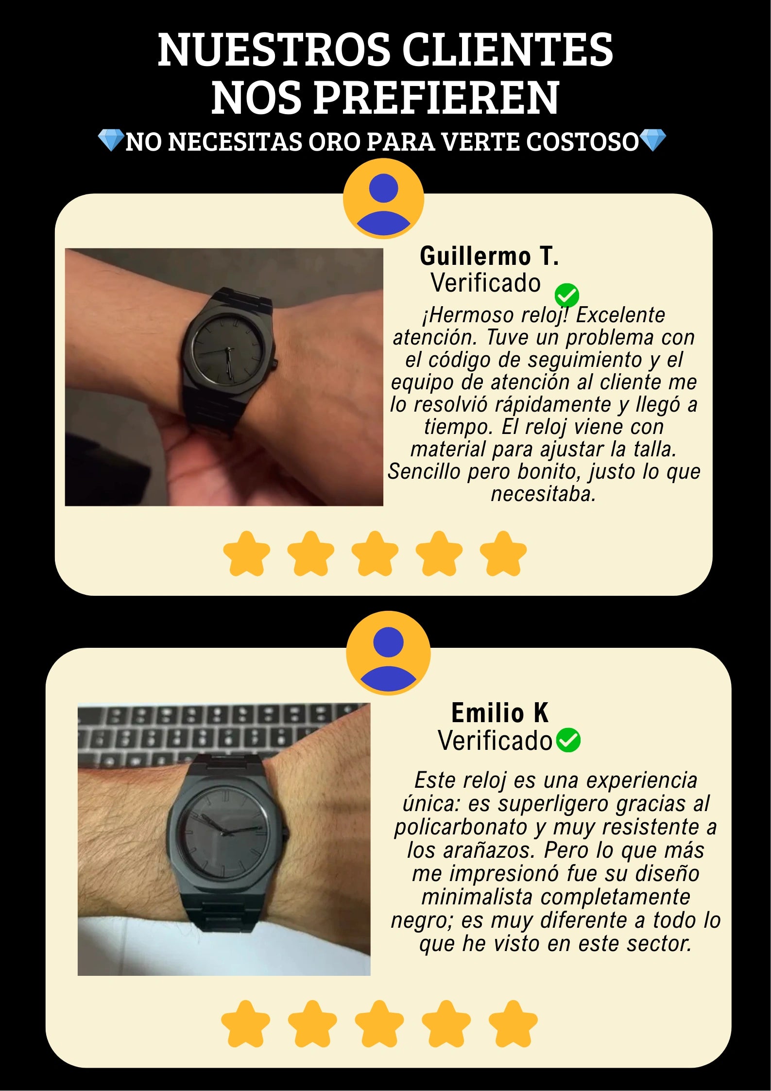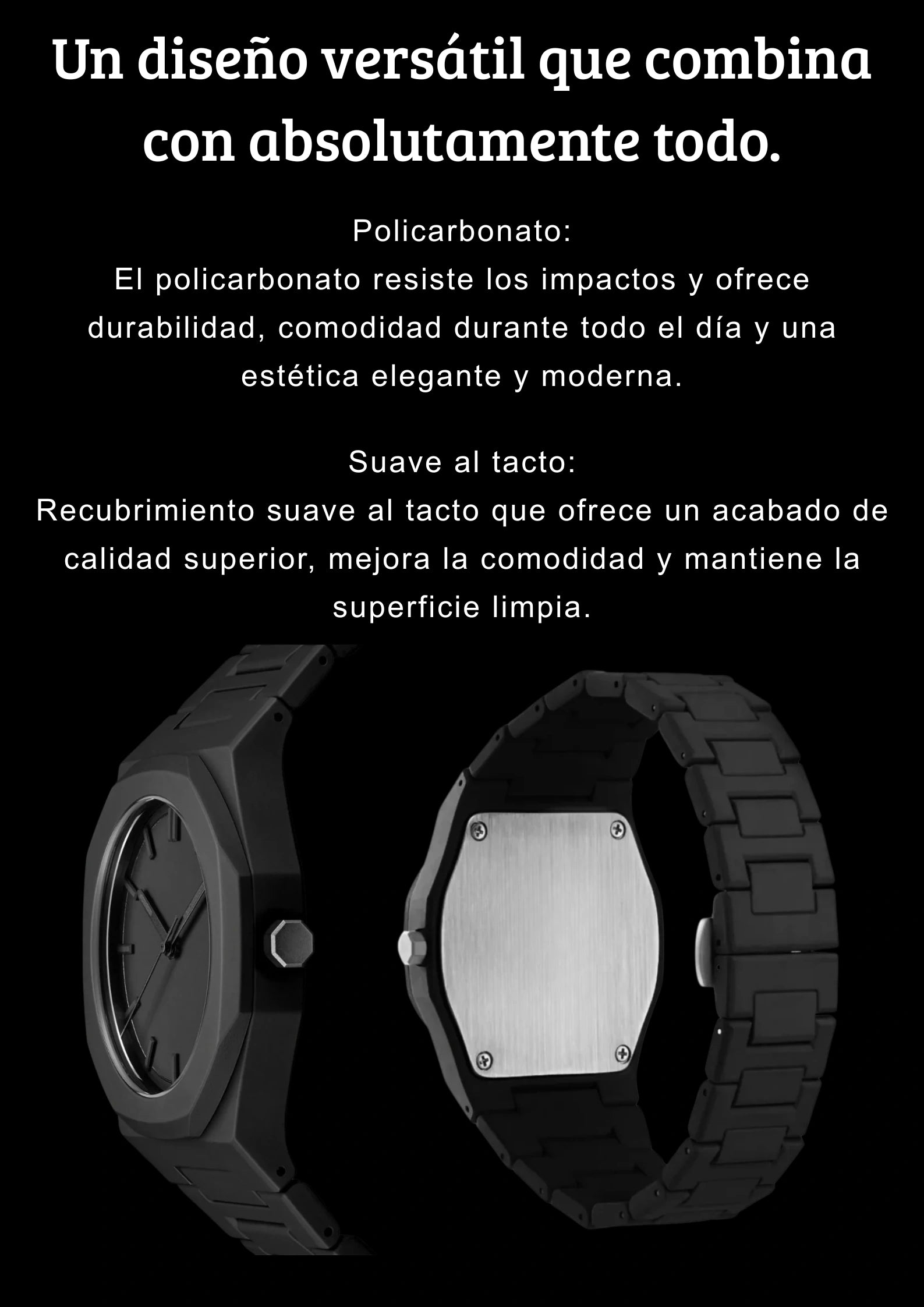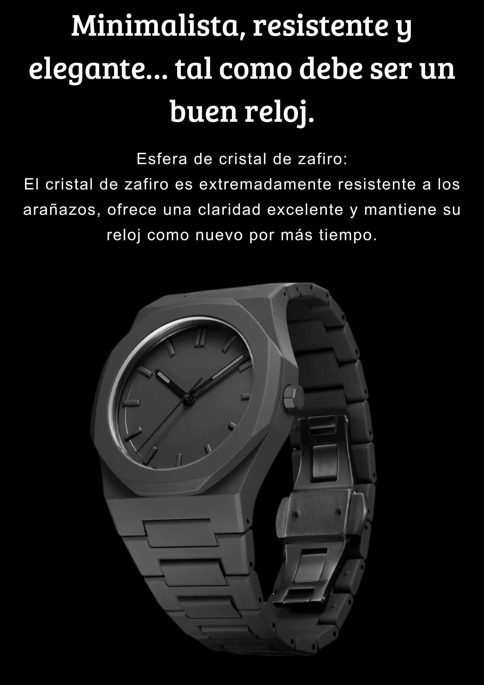 El Reloj está fabricado con acero inoxidable de alta calidad, resistente a golpes y al desgaste diario. Su correa ofrece un acabado premium y la esfera está protegida con cristal ZAFIRO mineral endurecido para mayor durabilidad y brillo.